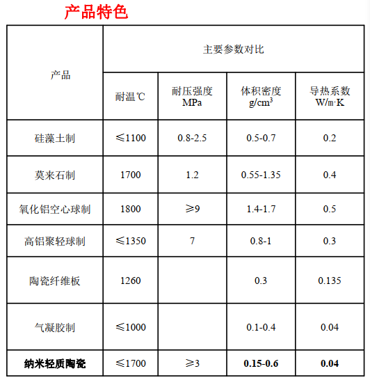 高溫隔熱保溫產(chǎn)品輕量化一直是相關(guān)領(lǐng)域研究的熱點,若能突破高溫隔熱產(chǎn)品的輕質(zhì)化,就有可能實現(xiàn)高溫設備的輕量化以及隔熱產(chǎn)品結(jié)構(gòu)的優(yōu)化,為此我公司研發(fā)的耐高溫納米輕質(zhì)陶瓷不僅能夠滿足1700℃及以上環(huán)境應用,并且實現(xiàn)產(chǎn)品的輕質(zhì)化以及高溫環(huán)境的超低導熱系數(shù)(對標目前市場所有產(chǎn)品,具有巨大優(yōu)勢)。